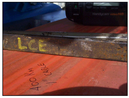 This photo illustrates how a belt wears after transferring 400 km of 1" armored cable and several dozen 5" splices. The metal bar across the belt helps to illustrate the negligible amount of grooving, which resulted from the job. The grooves are roughly 1/32"-1/16" deep. Belt life could exceed 50,000 km under similar circumstances.